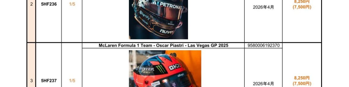 Date:2025年12月7日Posted By:Spark Japan 2Category:Pre order (予約注文)Tag:1/5helmet, F1, spark Preorder Information