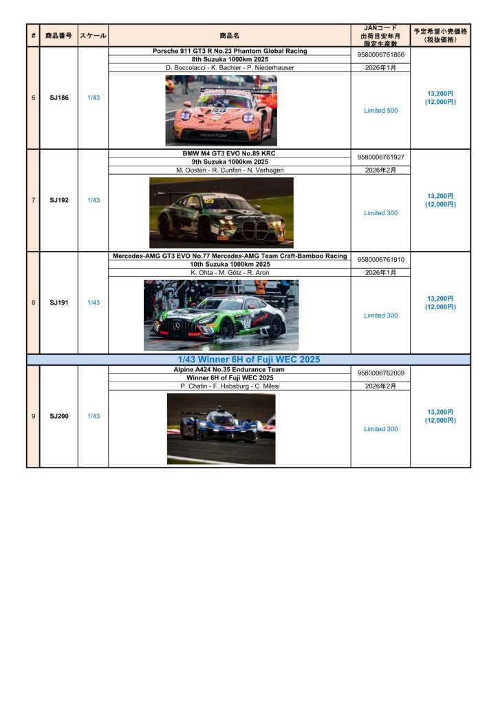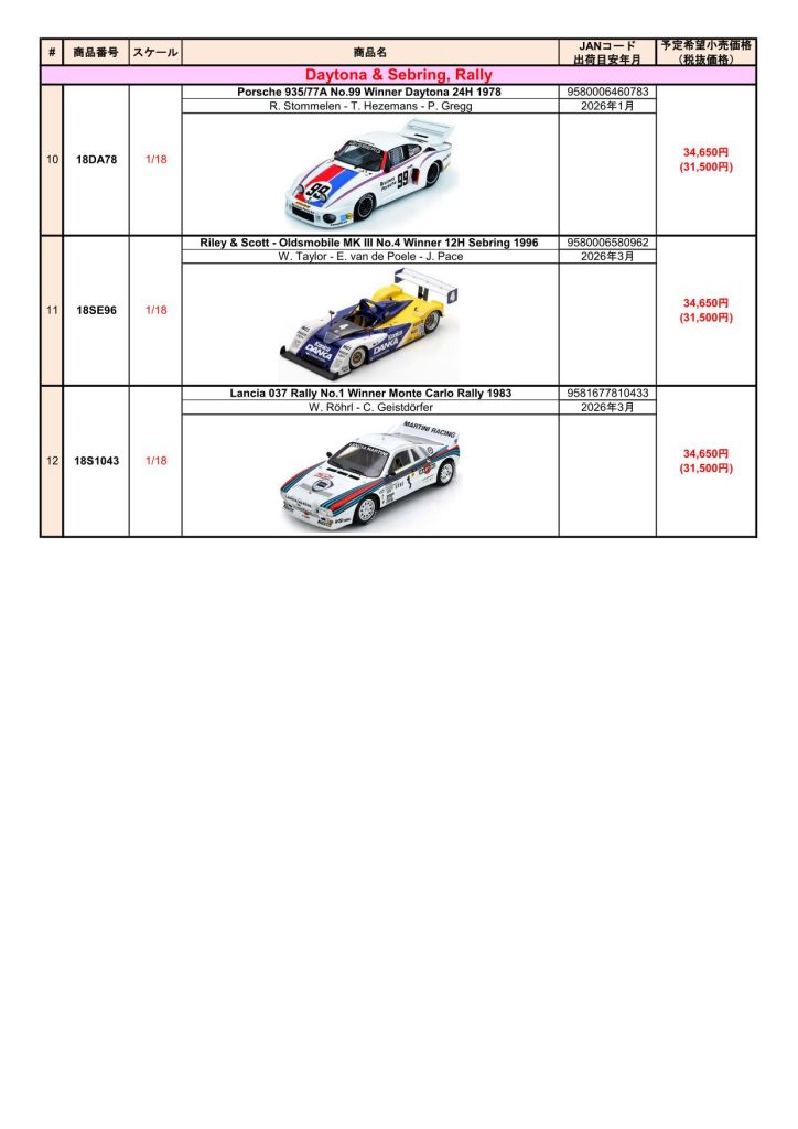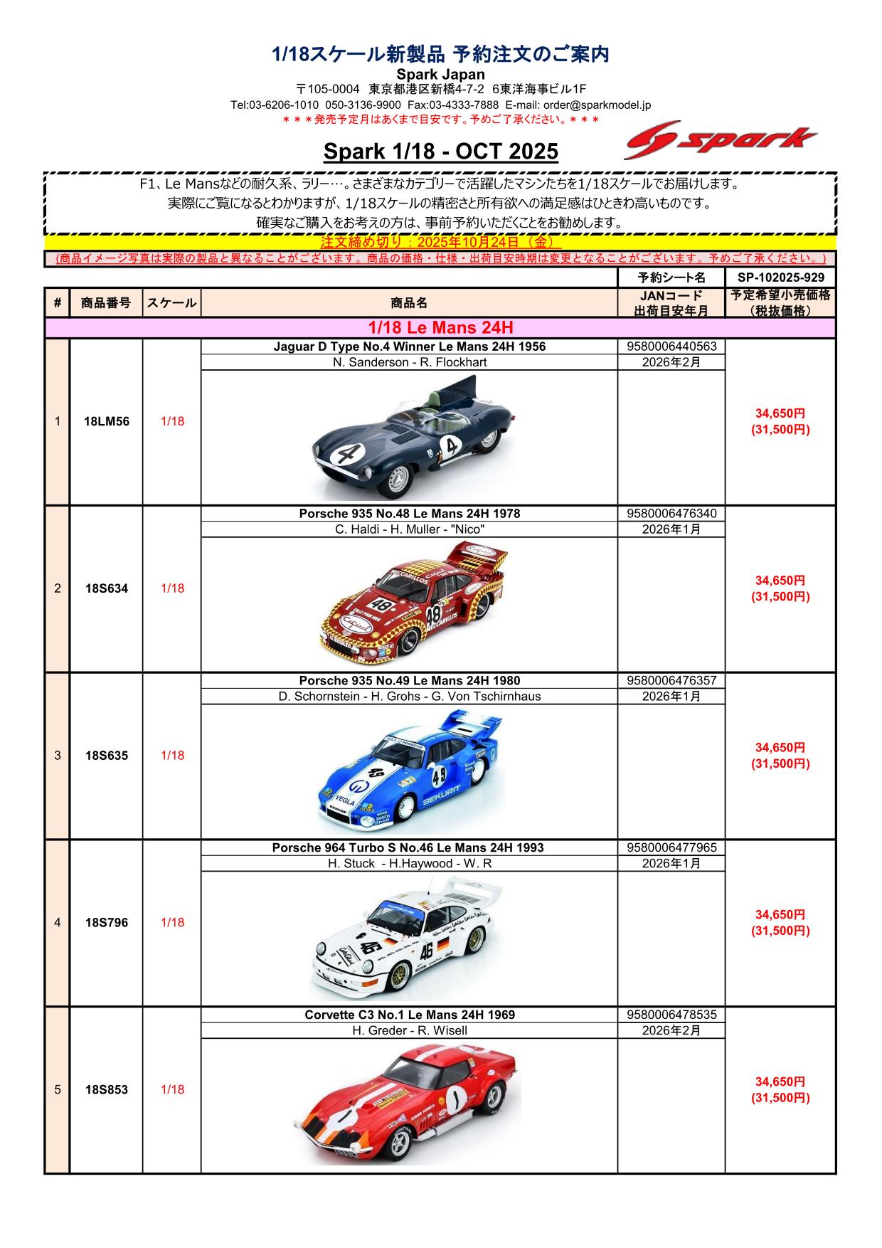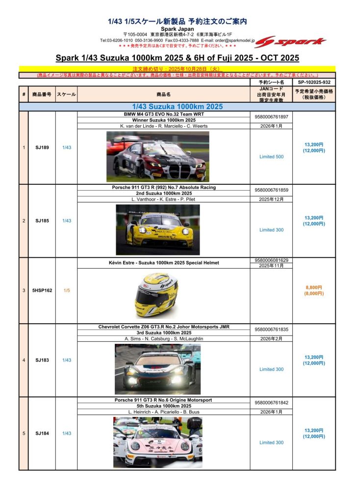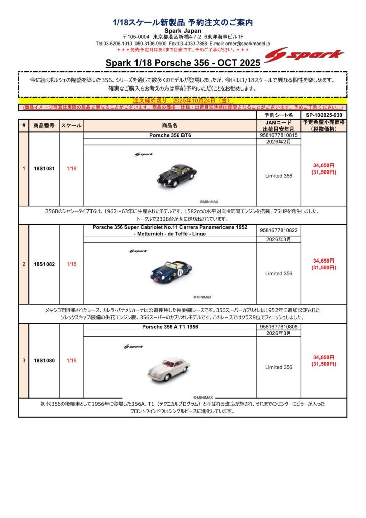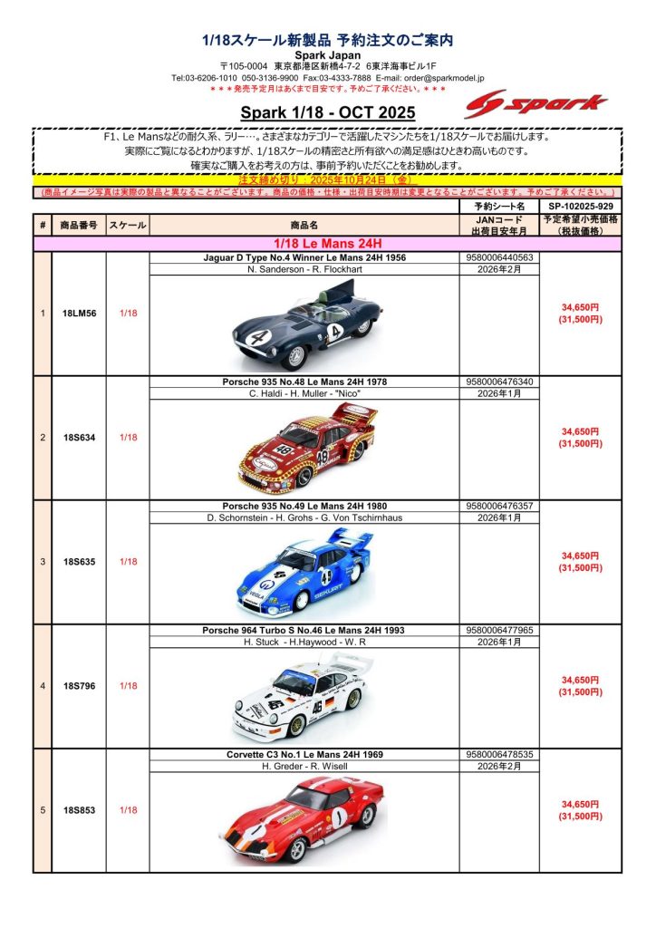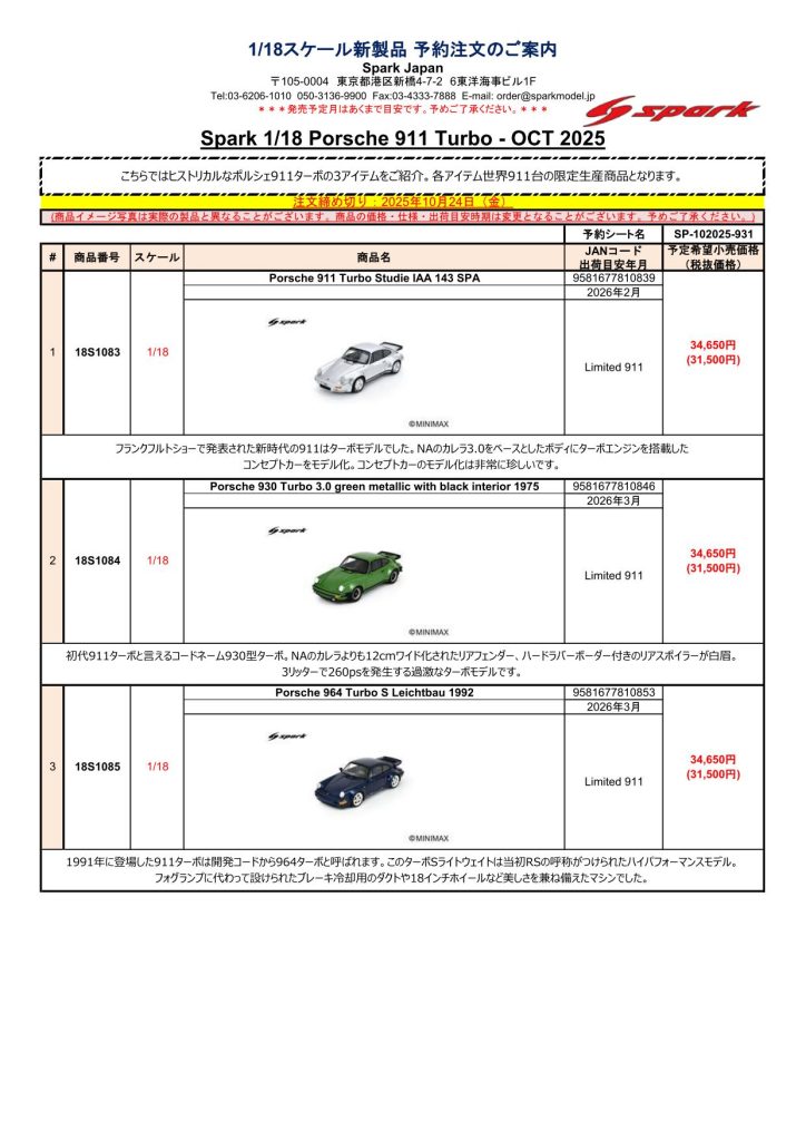 Date:2025年10月5日Posted By:Spark Japan 2Category:Pre order (予約注文)Tag:1/18, 1/43, Porsche, spark, 予約注文 Spark製品お取り扱いショップにて、現在予約注文を受け付け中の新製品です。弊社HPやお電話・メールでの予約受け付けはしておりませんのでご了承ください。