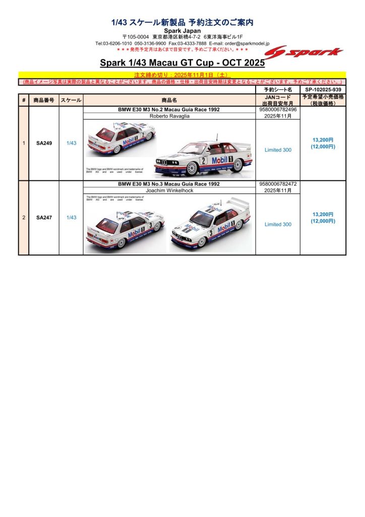 Date:2025年10月15日Posted By:Spark Japan 2Category:Pre order (予約注文)Tag:1/43, Macau, spark, 予約注文 Spark製品お取り扱いショップにて、現在予約注文を受け付け中の新製品です。弊社HPやお電話・メールでの予約受け付けはしておりませんのでご了承ください。