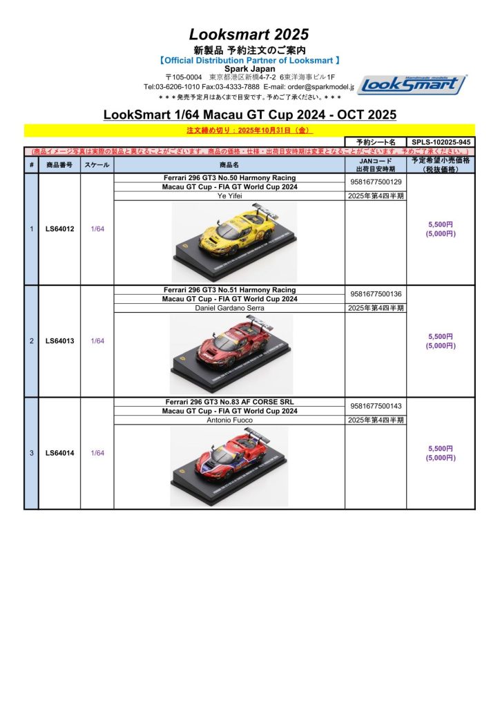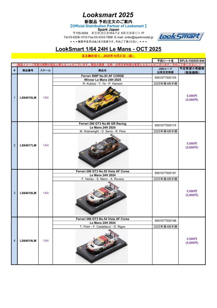Date:2025年10月24日Posted By:Spark Japan 2Category:Pre order (予約注文)Tag:1/64, Le Mans, Looksmart, 予約注文 Spark製品お取り扱いショップにて、現在予約注文を受け付け中の新製品です。弊社HPやお電話・メールでの予約受け付けはしておりませんのでご了承ください。