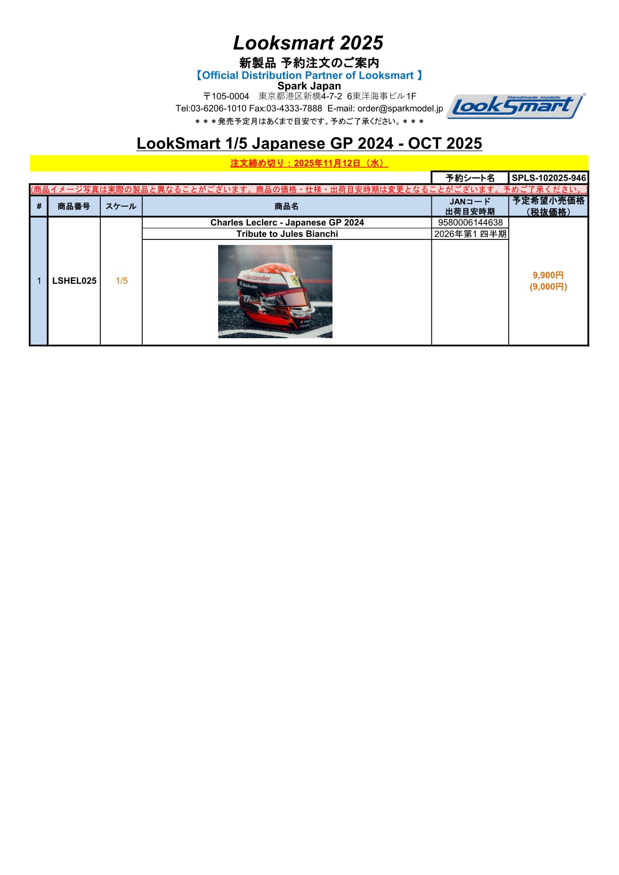 Date:2025年10月26日Posted By:Spark Japan 2Category:Pre order (予約注文)Tag:1/5, 1/5 F1 Helmet, Looksmart Spark製品お取り扱いショップにて、現在予約注文を受け付け中の新製品です。弊社HPやお電話・メールでの予約受け付けはしておりませんのでご了承ください。