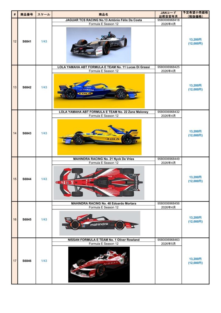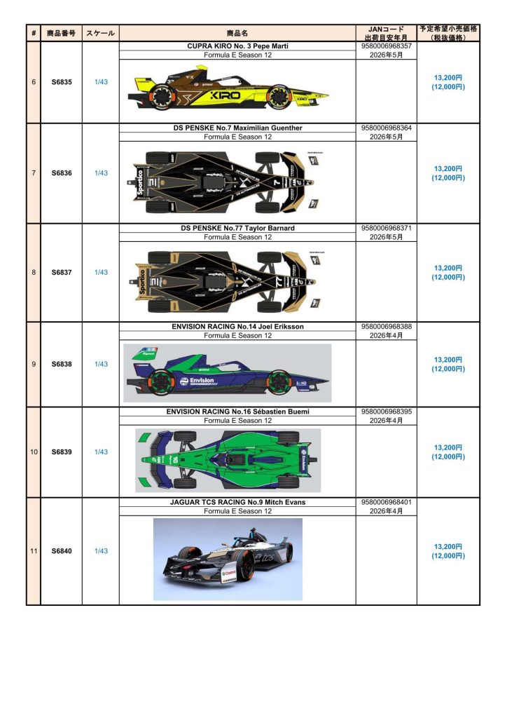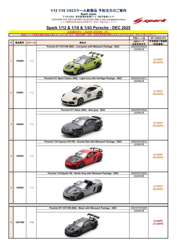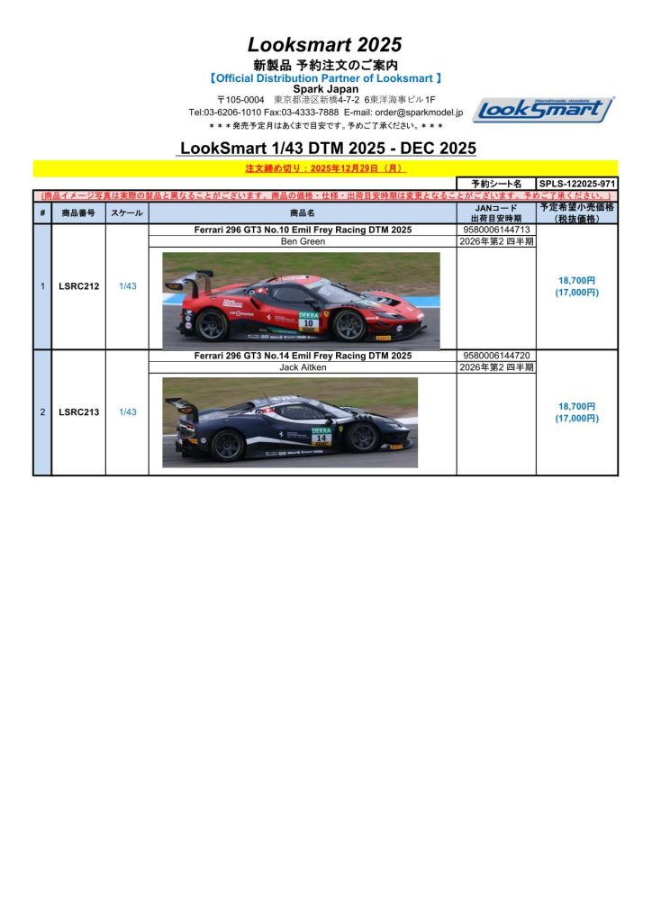 Date:2025年12月8日Posted By:Spark Japan 2Category:Pre order (予約注文)Tag:1/12, 1/18, 1/43, DTM2025, FORMULA E, Porsche, spark Spark製品お取り扱いショップにて、現在予約注文を受け付け中の新製品です。弊社HPやお電話・メールでの予約受け付けはしておりませんのでご了承ください。