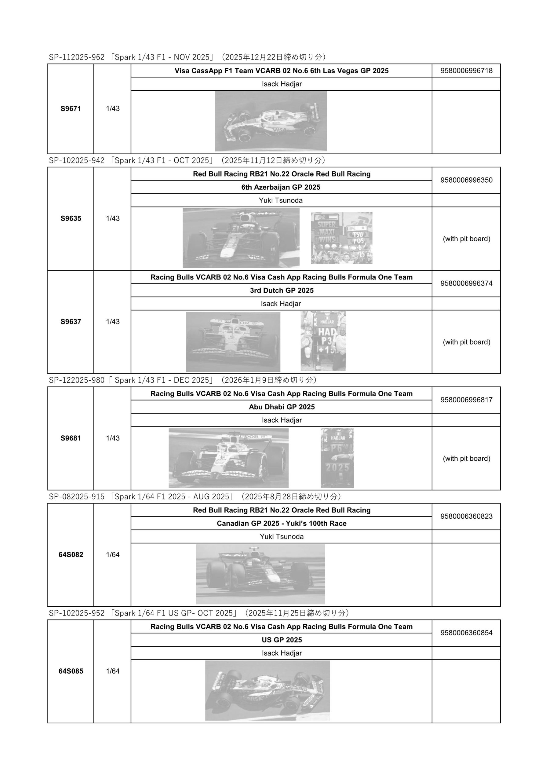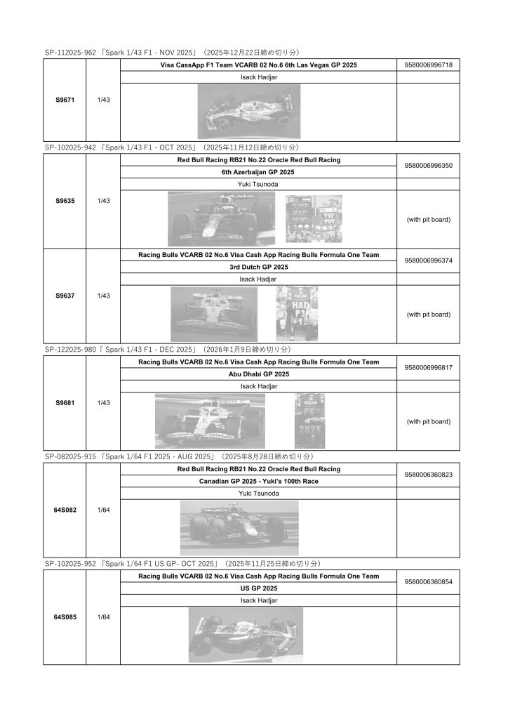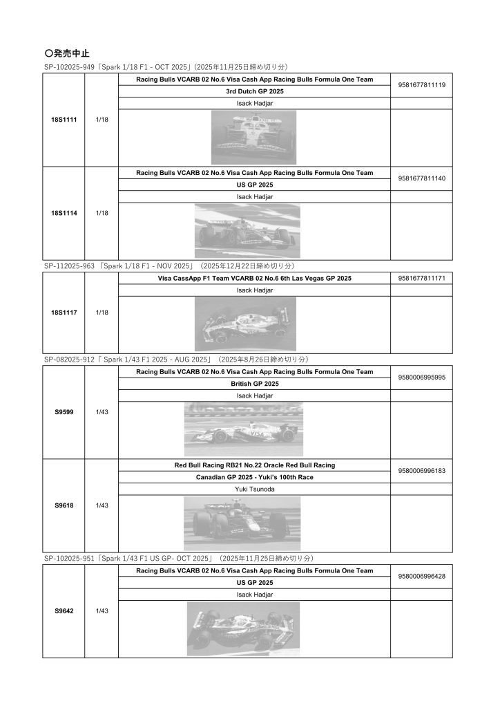 Date:2025年12月23日Posted By:Spark Japan 2Category:update information (更新情報)Tag:F1, 予約注文 先般ご案内した下記新製品は、諸般の事情により発売中止となりました。 ご予約をいただいていた皆様には大変申し訳ございません。なにとぞご了承のほどお願い申し上げます。