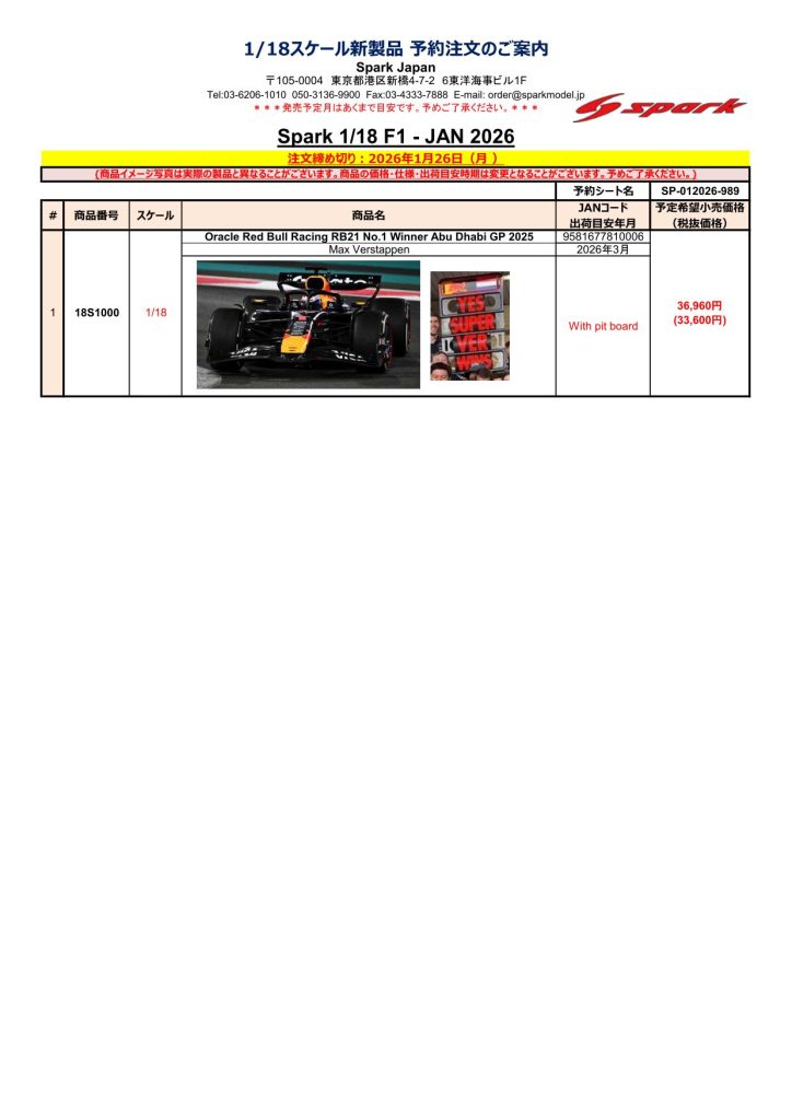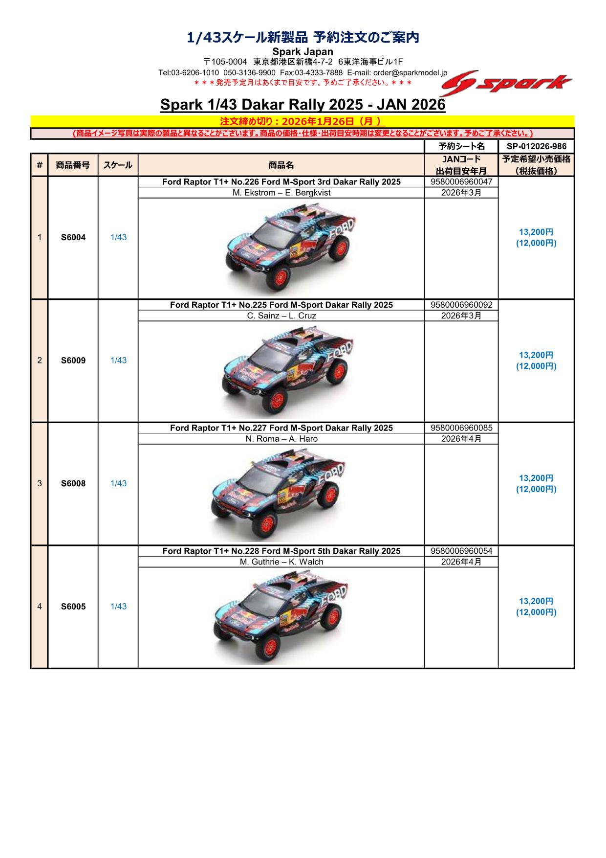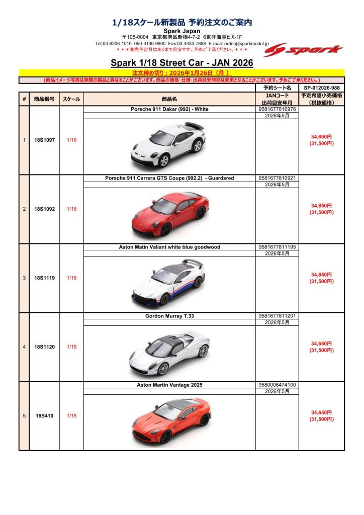 Date:2026年1月10日Posted By:Spark Japan 2Category:Pre order (予約注文)Tag:1/18, 1/43, Dakar RallY, F1, spark, Street Car, 予約注文 Spark製品お取り扱いショップにて、現在予約注文を受け付け中の新製品です。弊社HPやお電話・メールでの予約受け付けはしておりませんのでご了承ください。