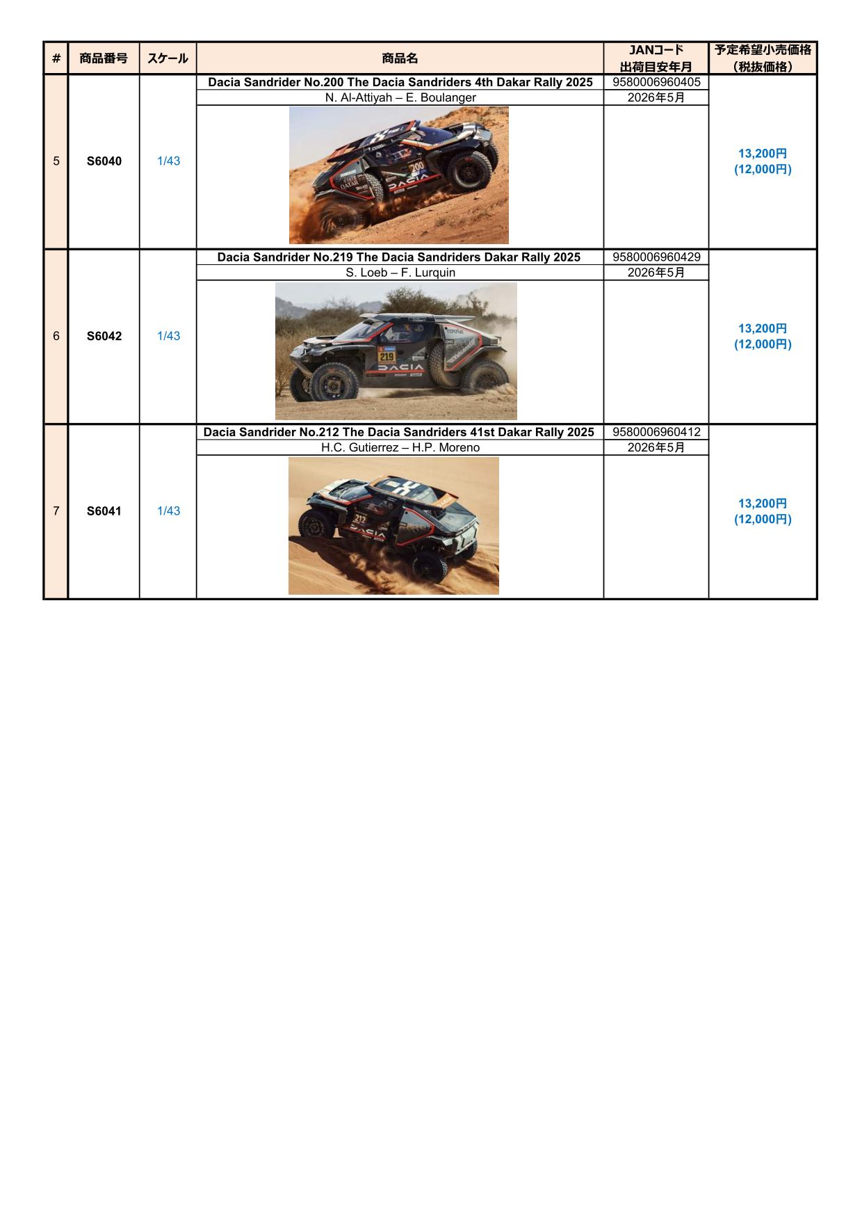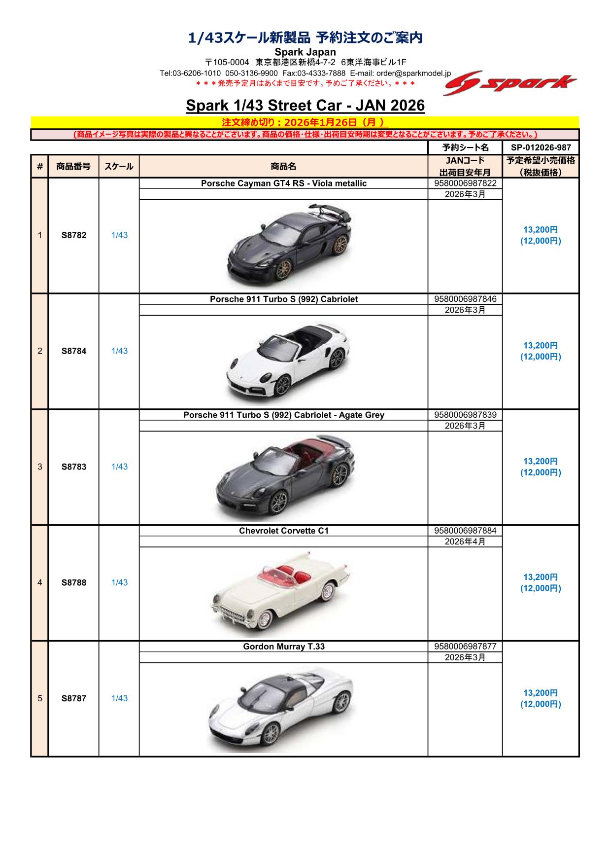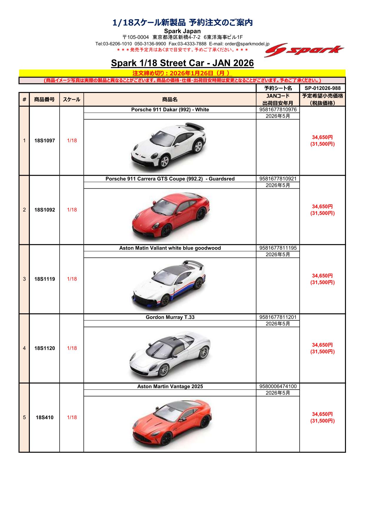 Date:2026年1月10日Posted By:Spark Japan 2Category:Pre order (予約注文)Tag:1/18, 1/43, Dakar RallY, F1, spark, Street Car, 予約注文 Spark製品お取り扱いショップにて、現在予約注文を受け付け中の新製品です。弊社HPやお電話・メールでの予約受け付けはしておりませんのでご了承ください。