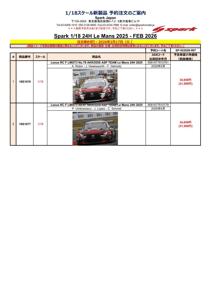 Date:2026年2月4日Posted By:Spark Japan 2Category:Pre order (予約注文)Tag:1/18, Le Mans, Lexus RC F, spark Spark製品お取り扱いショップにて、現在予約注文を受け付け中の新製品です。弊社HPやお電話・メールでの予約受け付けはしておりませんのでご了承ください。