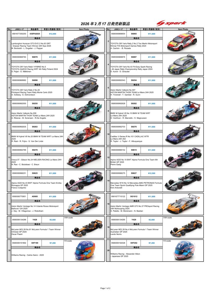 Date:2026年2月19日Posted By:Spark Japan 2Category:New product information (新商品情報)Tag:1/43, F1, Looksmart, spark, SUPER GT, 新商品 Spark / LookSmart製品お取り扱いショップにて、2月17日から発売となった新製品をご案内いたします。