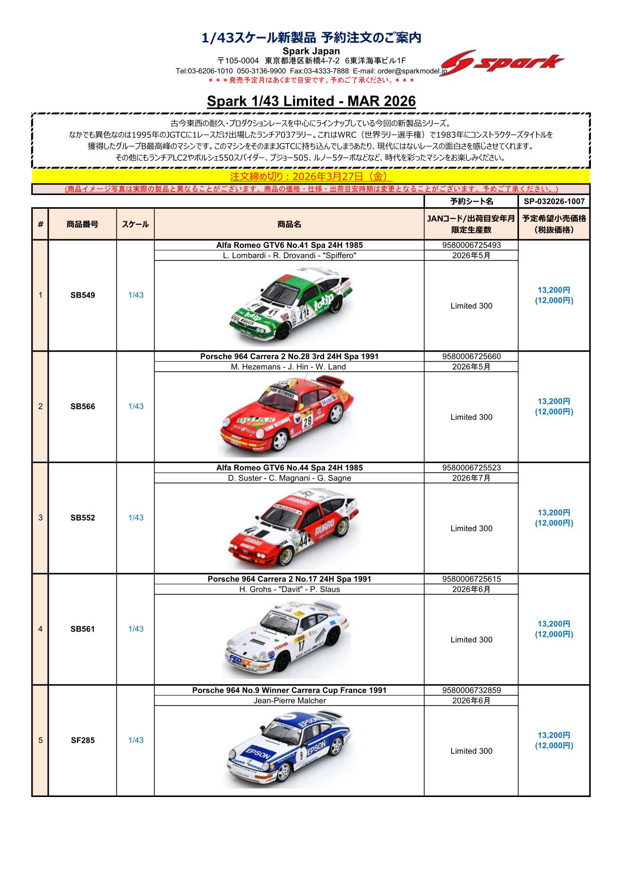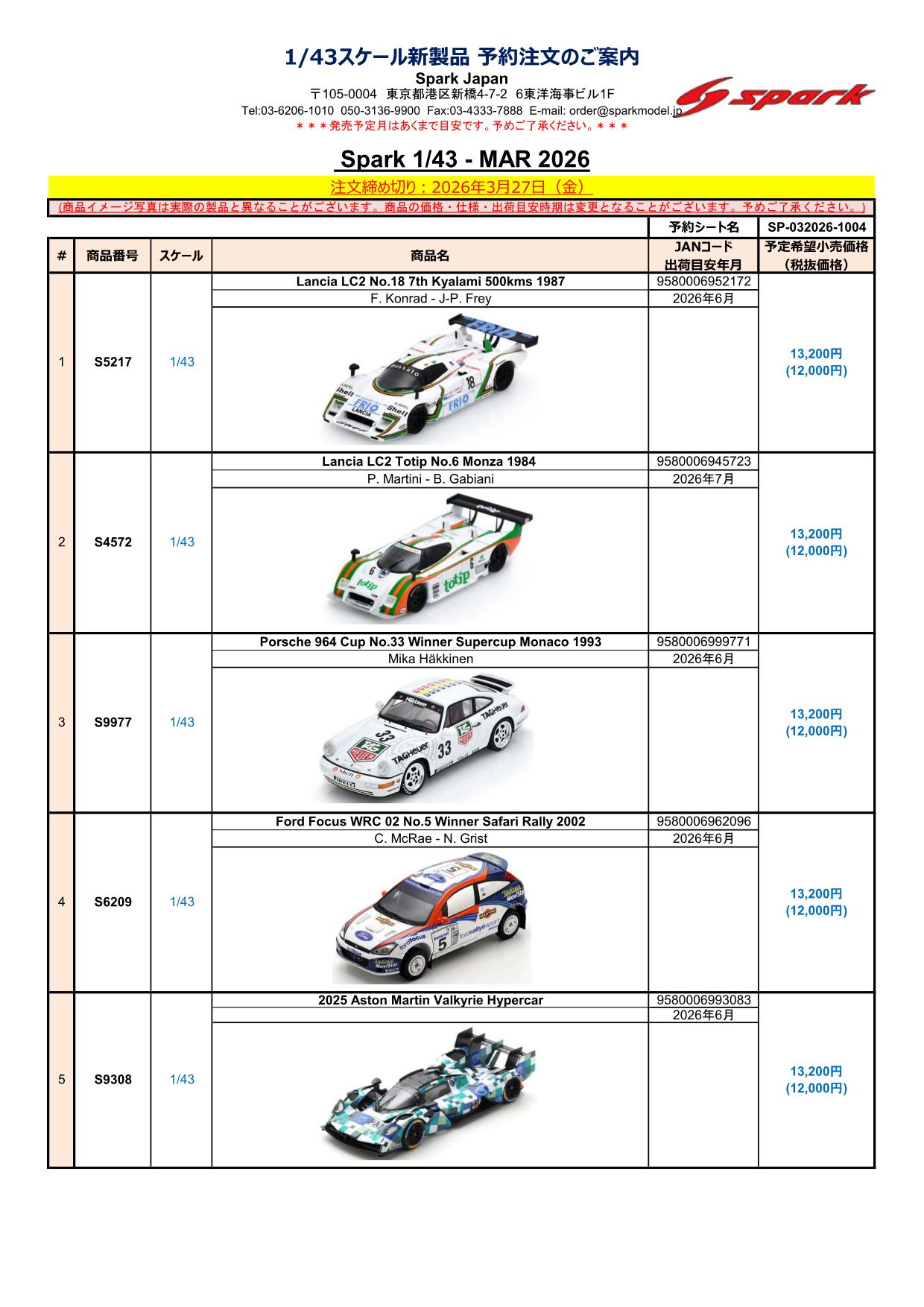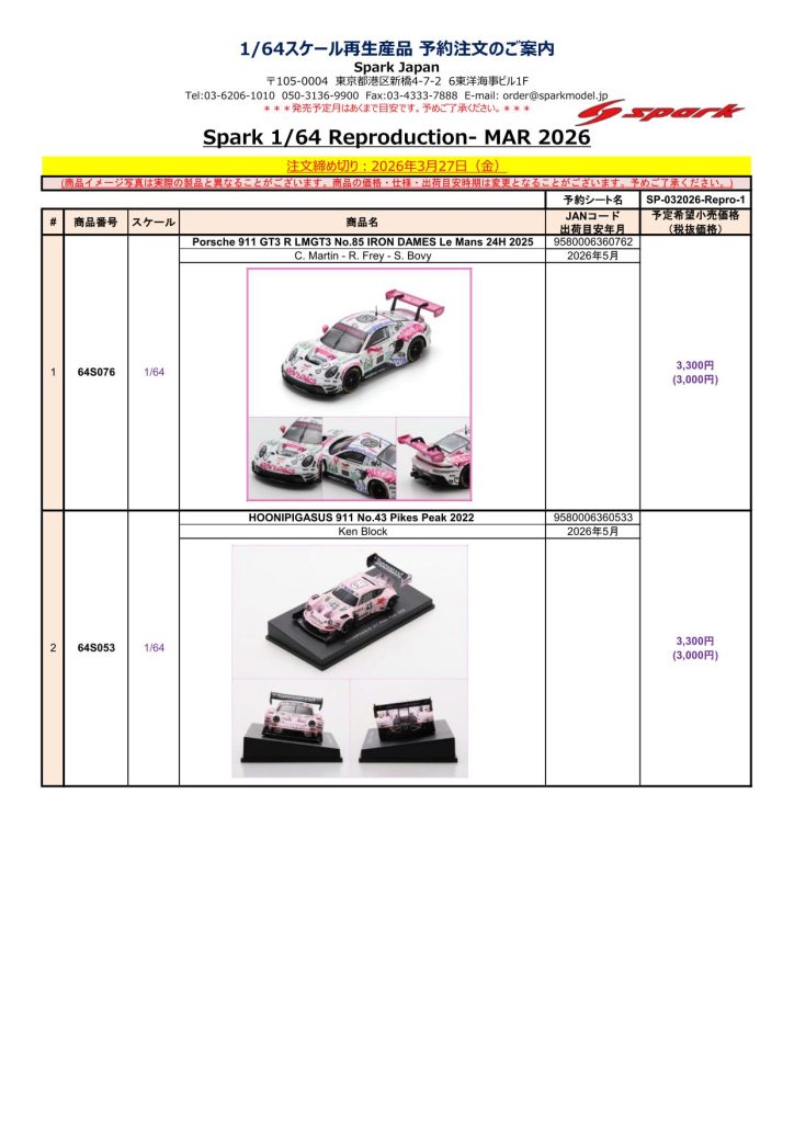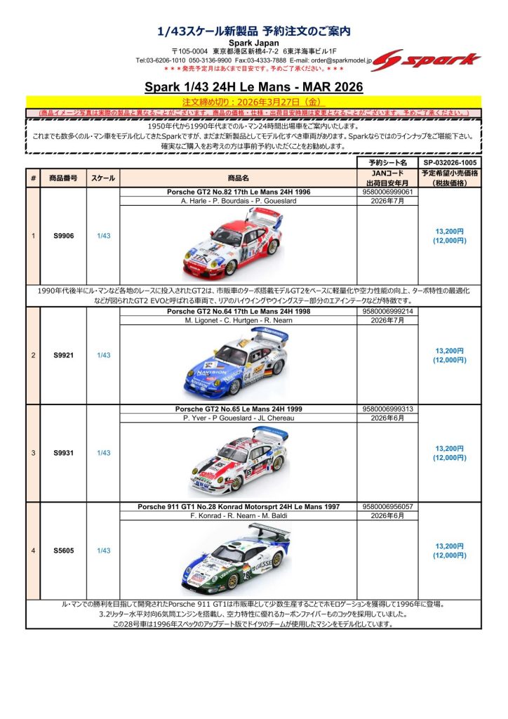 Date:2026年3月12日Posted By:Spark Japan 2Category:Pre order (予約注文)Tag:1/43, F1, Le Mans, spark, 予約注文 Spark / LookSmart / Schuco製品お取り扱いショップにて現在予約注文を受け付け中の商品をご案内します。弊社は電話・メールでの予約は受け付けておりません。予めご了承ください。
