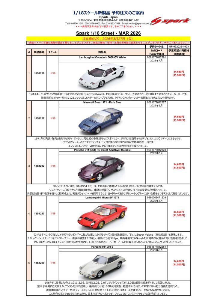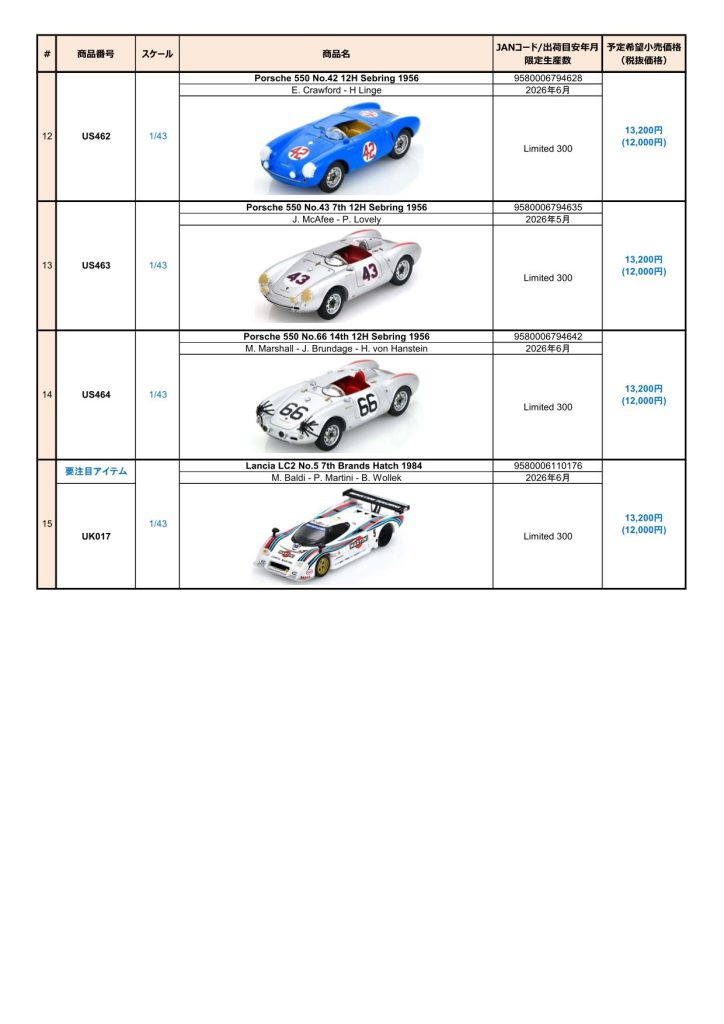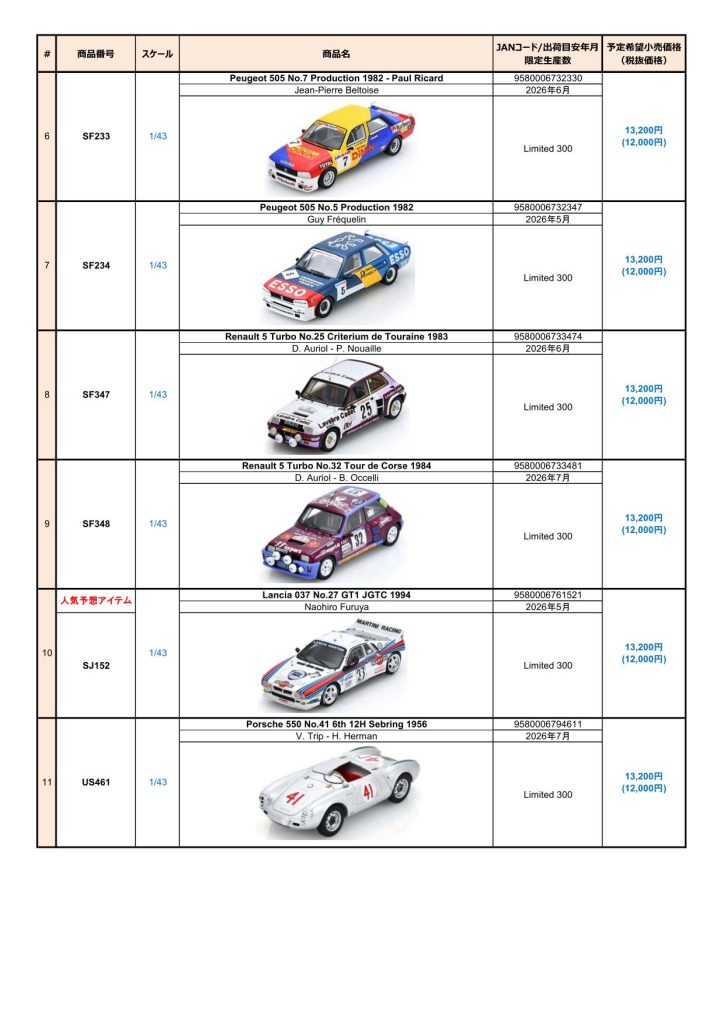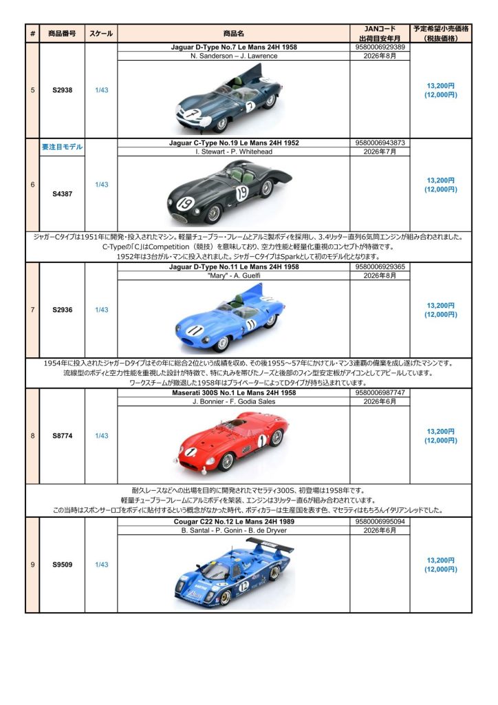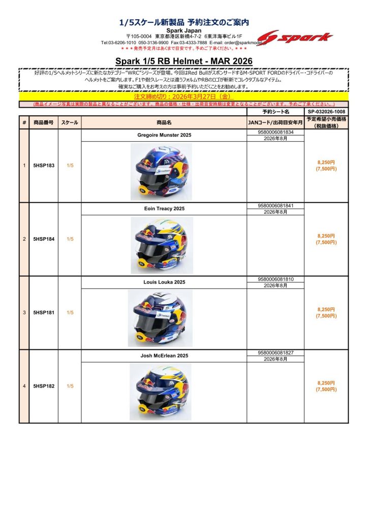 Date:2026年3月12日Posted By:Spark Japan 2Category:Pre order (予約注文)Tag:1/43, F1, Le Mans, spark, 予約注文 Spark / LookSmart / Schuco製品お取り扱いショップにて現在予約注文を受け付け中の商品をご案内します。弊社は電話・メールでの予約は受け付けておりません。予めご了承ください。