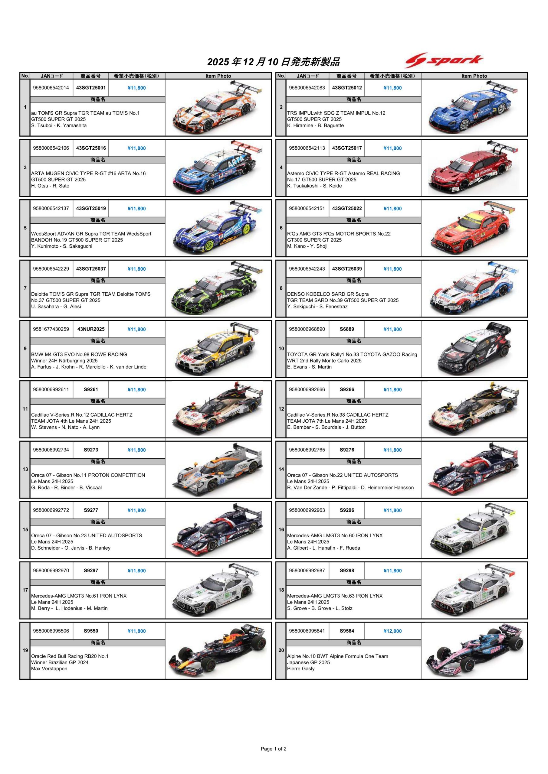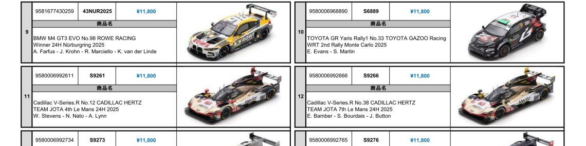 Date:2025年6月11日Posted By:Spark Japan 2Category:Pre order (予約注文)Tag:1/18, 1/43, F1, Le Mans, Looksmart, Schuco, spark, SUPER GT, 予約注文, 新商品 Preorder Information