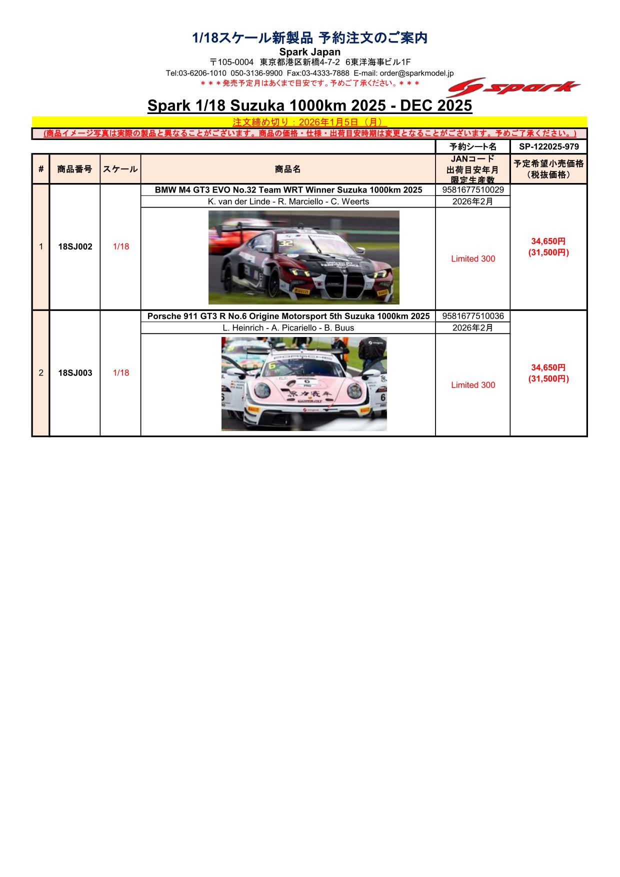 Date:2025年12月15日Posted By:Spark Japan 2Category:Pre order (予約注文)Tag:1/18, spark, Suzuka1000km Preorder Information